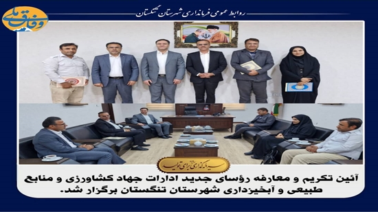 در این مراسم از رؤسای پیشین دو اداره در طول دوره تصدی تقدیر و آزاده قاسم زاده بعنوان رئیس جدید جهاد کشاورزی و الیاس رزمی بعنوان رئیس جدید منابع طبیعی و آبخیزداری شهرستان تنگستان معرفی شدند‌.