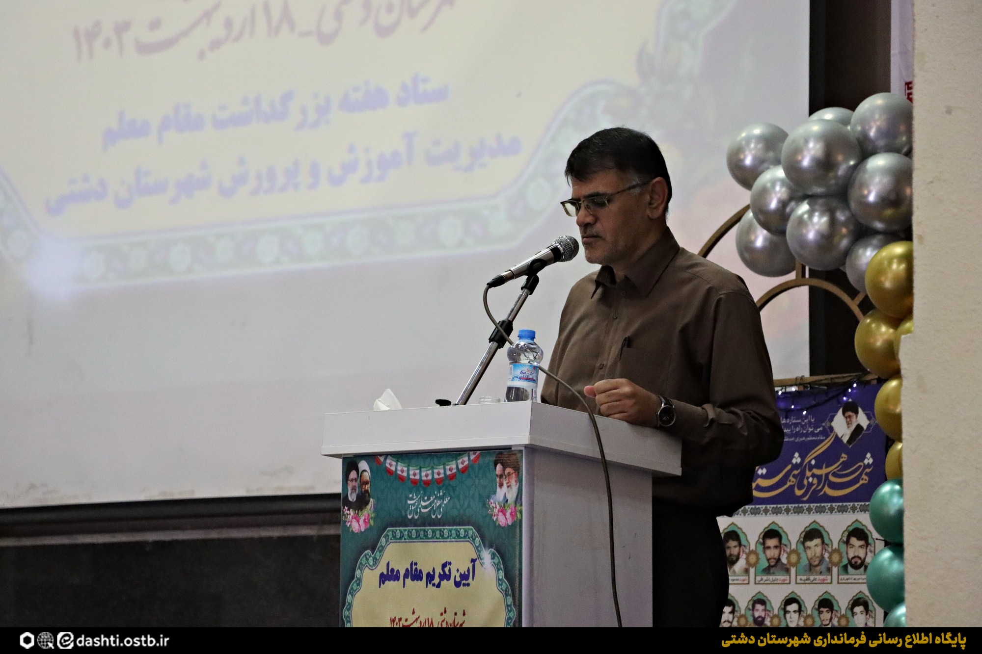 به گزارش روابط عمومی فرمانداری شهرستان دشتی ، فرماندار دشتی در این مراسم ضمن تبریک هفته معلم اظهار داشت: در نظام دینی ما که مبتنی بر وحی و پیام الهی است احترام به معلم و علم همیشه زبان زد و مورد تاکید همه بزرگان بوده است.