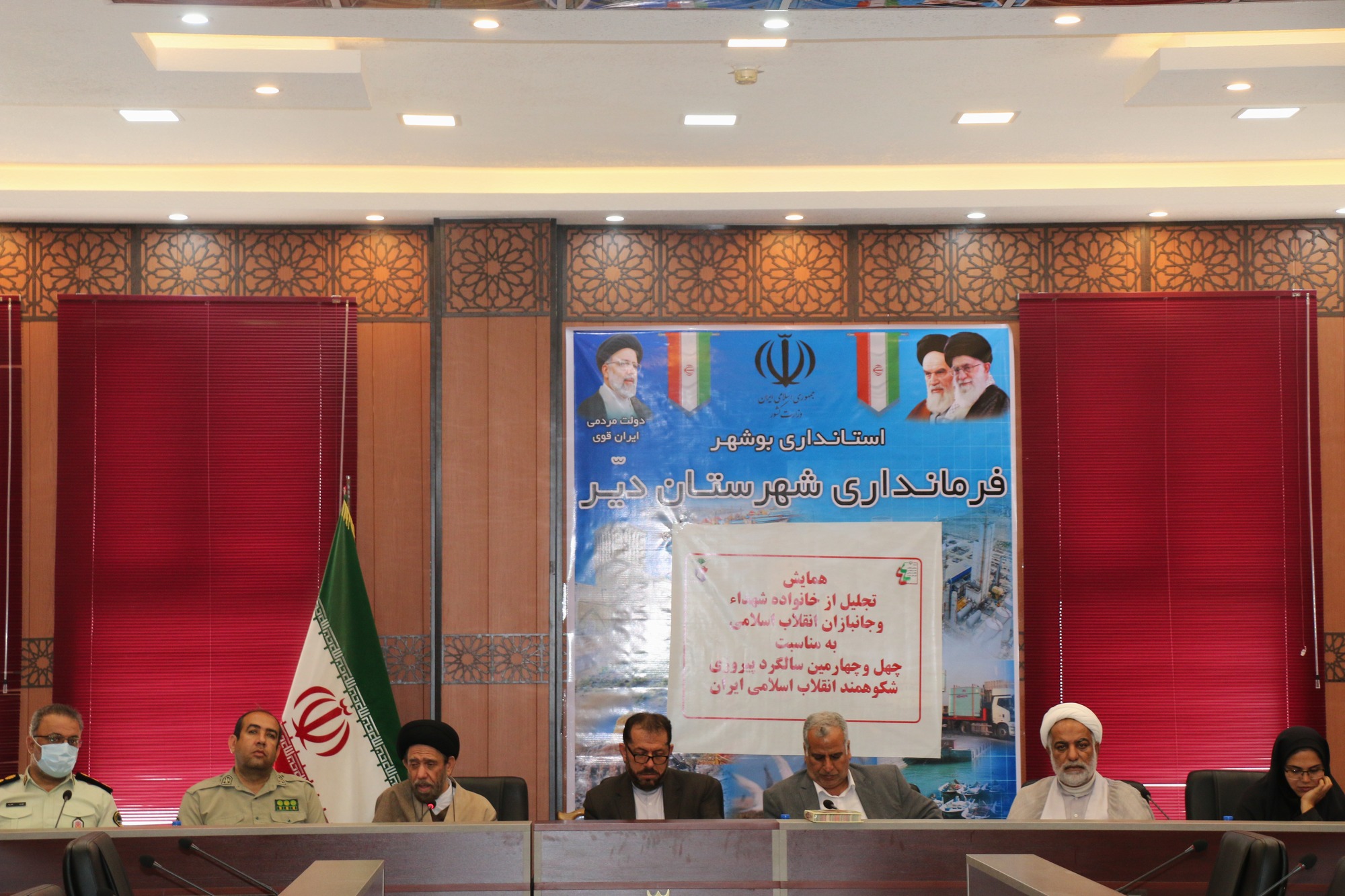 به گزارش روابط عمومی فرمانداری دیّر، فرماندار شهرستان دیّر در آئین تجلیل از خانواده شهدا و جانبازان انقلاب شهرستان دیّر با گرامیداشت دهه فجر، اظهار داشت: انقلاب اسلامی در استان بوشهر اولین بار از بندر دیّر صادر شد که سند گویای آن تقدیم دو شهید و چندین جانباز قبل از پیروزی انقلاب است.