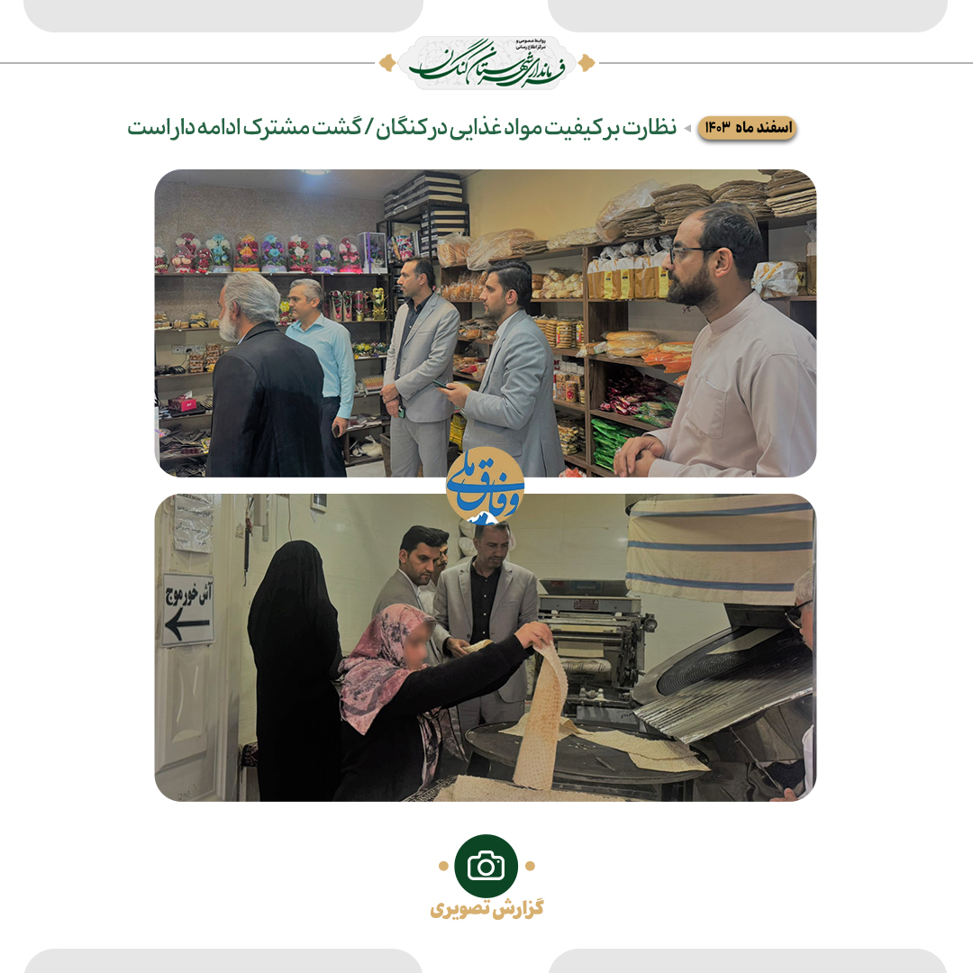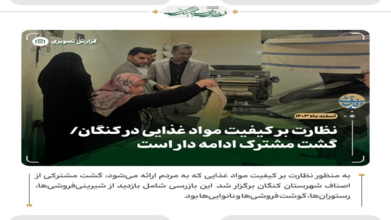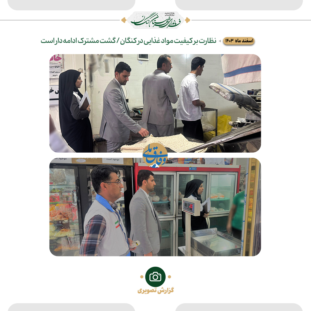 به گزارش روابط عمومی فرمانداری کنگان، به منظور نظارت بر کیفیت مواد غذایی که به مردم ارائه می‌شود، گشت مشترکی از اصناف شهرستان کنگان برگزار شد.