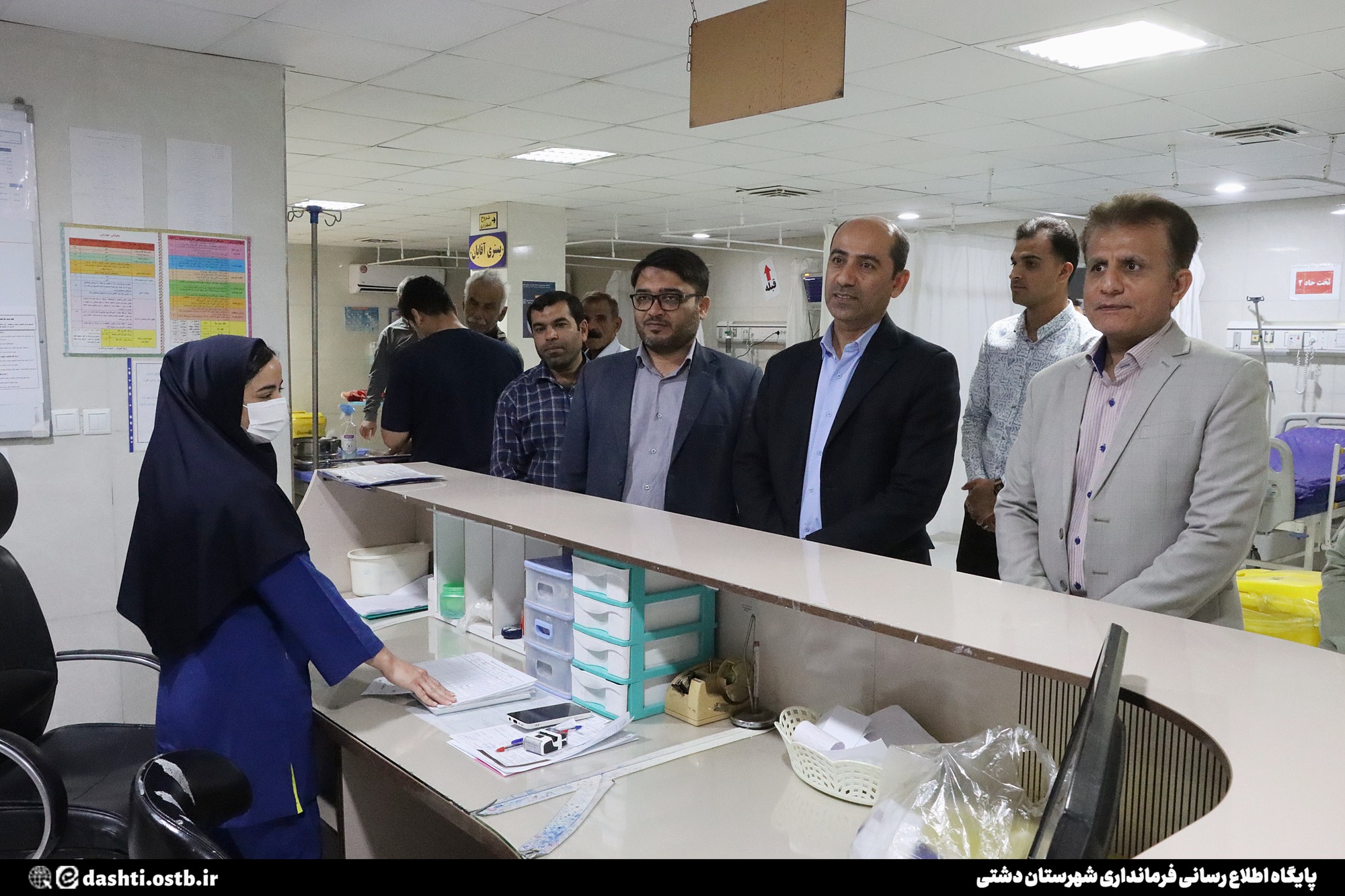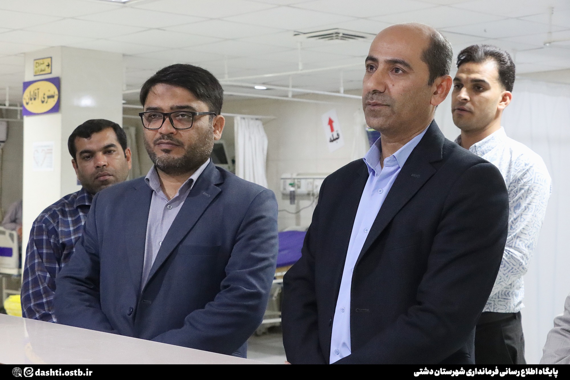 فرماندار دشتی از بخشهای مختلف بیمارستان از جمله اورژانس، آزمایشگاه و داروخانه دیدن کرد و با کادر درمانی و بیماران گفتگو نمود.
