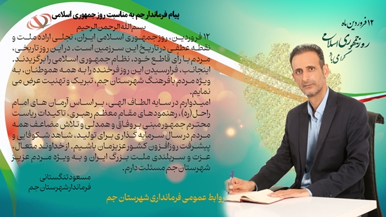 ۱۲ فروردین، روز جمهوری اسلامی ایران، تجلی اراده ملت و نقطه عطفی در تاریخ این سرزمین است. در این روز تاریخی، مردم با رأی قاطع خود، نظام جمهوری اسلامی را برگزیدند. اینجانب، فرارسیدن این روز فرخنده را به همه هموطنان، به‌ویژه مردم بافرهنگ شهرستان جم، تبریک و تهنیت عرض می‌نمایم.